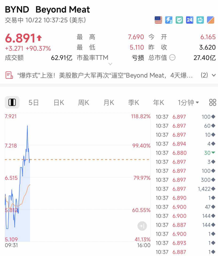 北京时间10月22日晚间,美股开盘后,Beyond Meat再度飙涨,一度暴涨超112%,盘中多次触及熔断,截至发稿,涨幅为90.37%,使得该股本周累计涨幅扩大至993.47%。