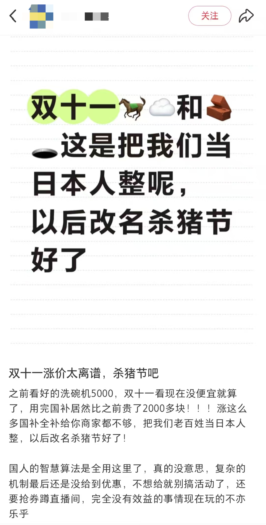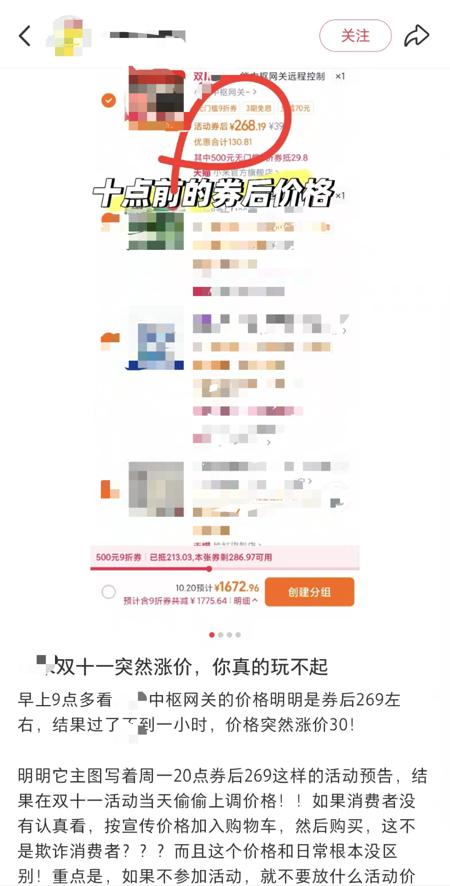 (消费者反馈双十一价格上升的内容 图片来源:社交媒体平台)
