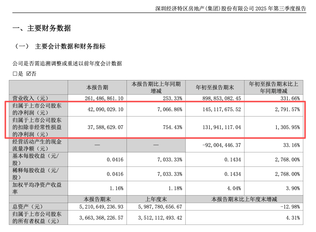 今年前三季度,深深房A实现营业收入8.99亿元,同比增长331.66%;归属上市公司股东净利润1.45亿元,同比增长2791.57%。其中,第三季度公司实现归属净利润4209万元,同比增长7066.86%。