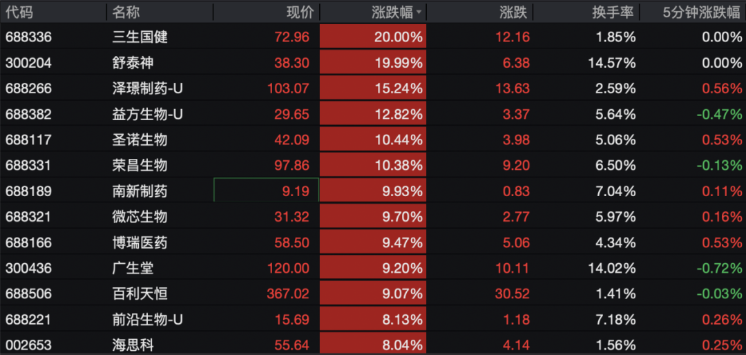 10月31日,A股创新药概念股集体爆发,截至13:30,三生国健、舒泰神强势斩获20%涨停,泽璟制药-U、益方生物-U、圣诺生物、荣昌生物等个股大涨超10%,南新制药、广生堂、博瑞医药、百利天恒、前沿生物-U等个股跟涨。