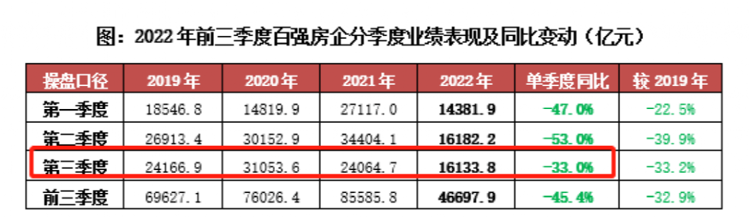而2022年1-9月,百强房企累计销售操盘金额46697.9亿元,同比降幅仍保持在45.4%的较高水平。虽然三季度以来同比降幅收窄,但目前行业下行压力持续、市场信心及购买力尚处在低位,企业整体的去化压力仍然较大。
