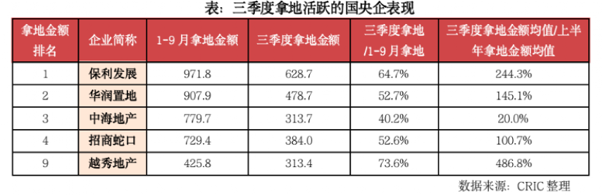 规模化的国央企几乎成为核心集中供地城市唯一的真正的“参与者”,三季度表现的尤为显著。保利、华润、招商、越秀等三季度拿地金额占到1-9月比例超过60%,除中海外,其余企业三季度月均拿地金额均较上半年增长超过100%。