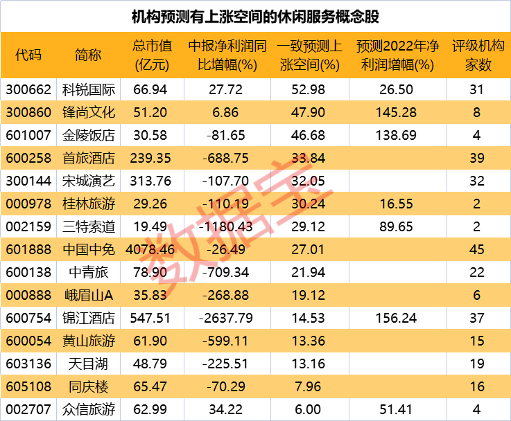 证券时报·数据宝统计,根据机构预测目标价与个股最新价差值计算,后市有上涨空间的休闲服务概念股共计15只。其中,科锐国际、锋尚文化、金陵饭店排名靠前,最新价较目标价相差45%以上;首旅酒店、宋城演艺和桂林旅游上涨空间也逾30%。