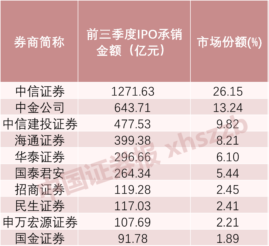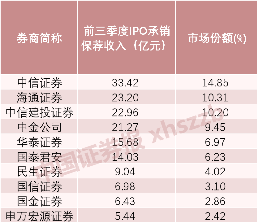 今年前三季度,市场波动下证券业整体收入承压,但在IPO承销保荐业务方面仍有不少券商迎来丰收。