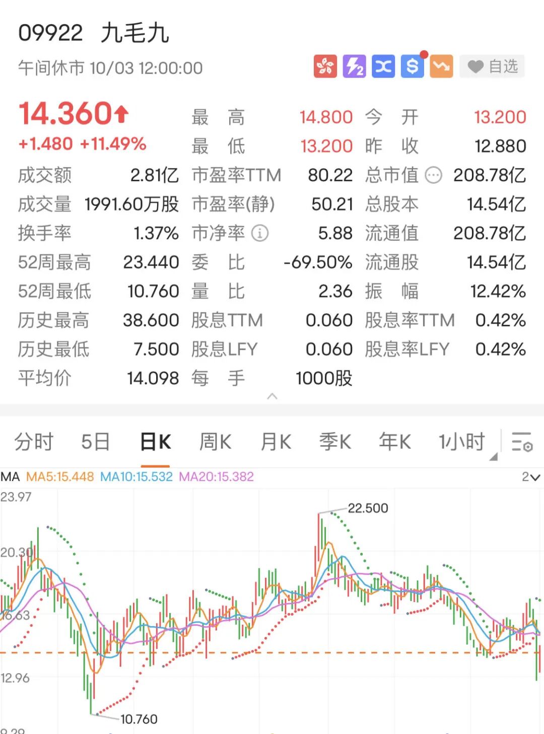 连锁餐饮上市公司九毛九今日高开后大幅反弹,盘中一度涨超14%,上周五收跌20.4%,截至午间收盘涨幅为11.49%, 报收14.36港元。九毛九近日曾被传跨界进入房地产,公司相关负责人日前回应称:只是买办公楼,并非进军房地产。