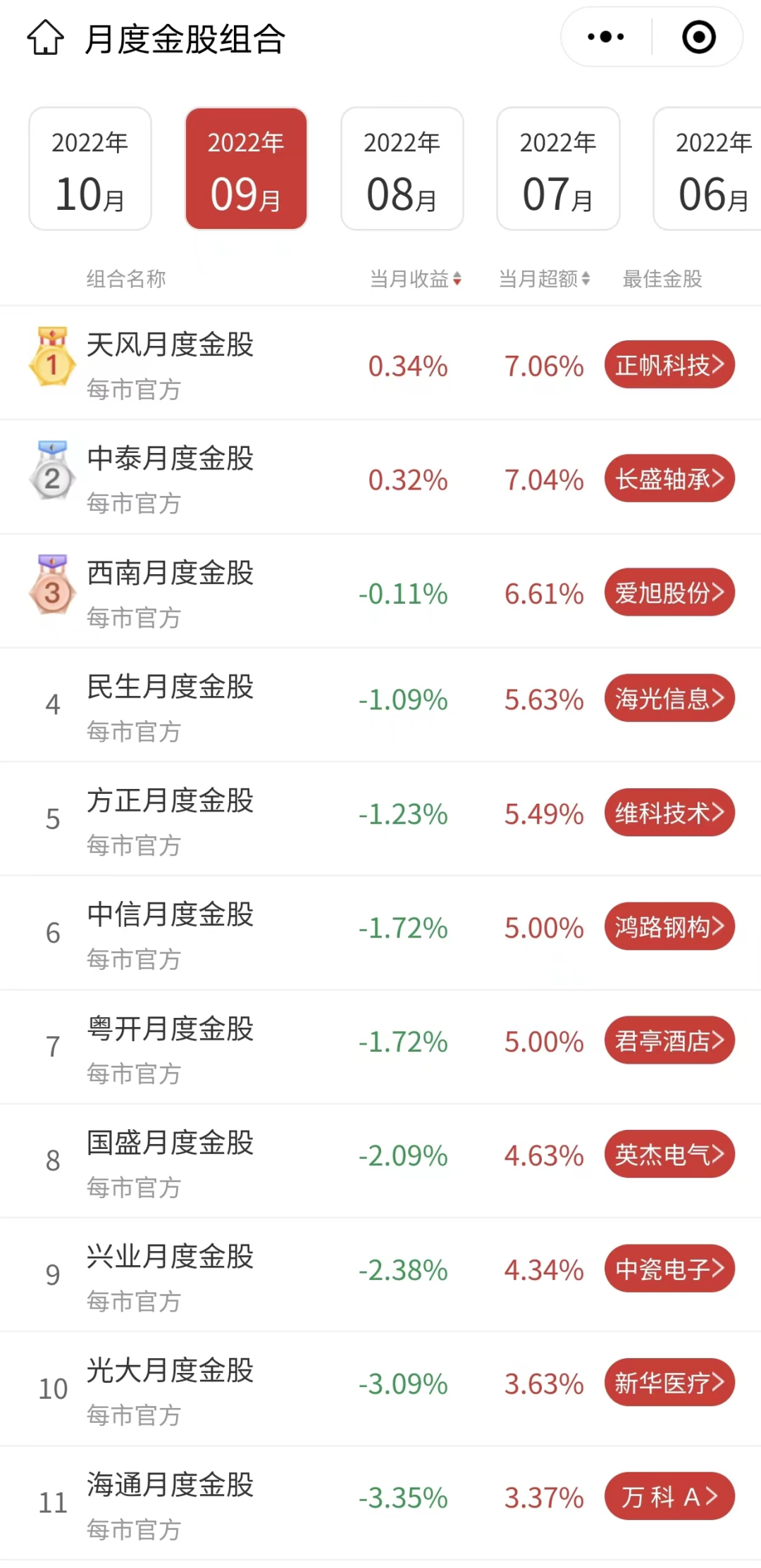 根据每市数据,在49家券商金股组合中,仅2家券商的金股组合9月收益率为正数,分别为天风证券和中泰证券的月度金股组合,当月收益分别为0.34%和0.32%,分别排名第一和第二。