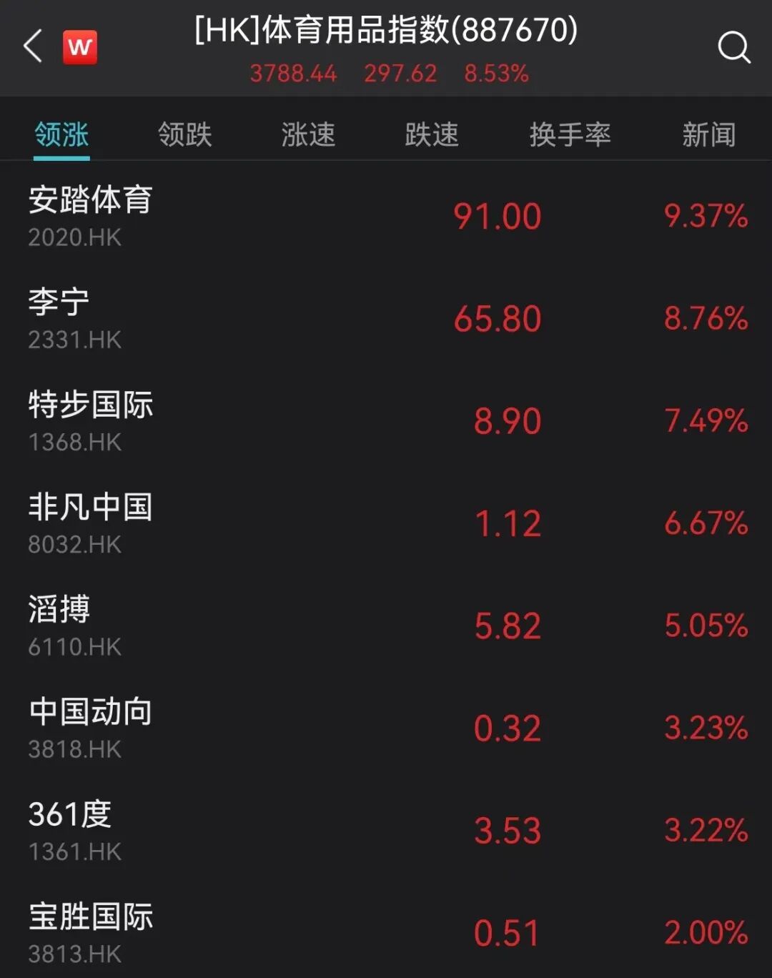 成分股中,安踏体育上涨超9%,李宁上涨8.76%,特步、滔博、361度纷纷跟涨。