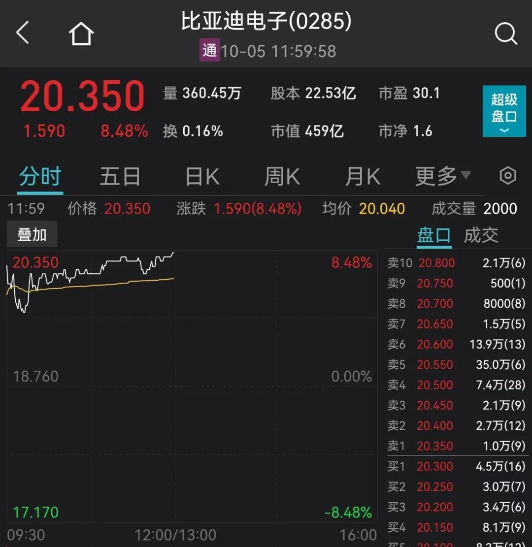 在比亚迪销售大涨的带动下,比亚迪电子也大涨超8%。