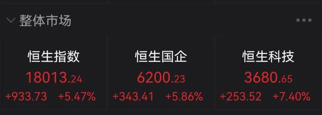 截至发稿,恒指大涨超5%,恒生科技指数涨7.4%,1194只个股上涨。