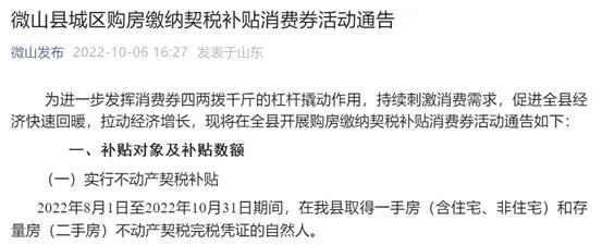 10月6日,“微山发布”公众号发布《微山县城区购房缴纳契税补贴消费券活动通告》。