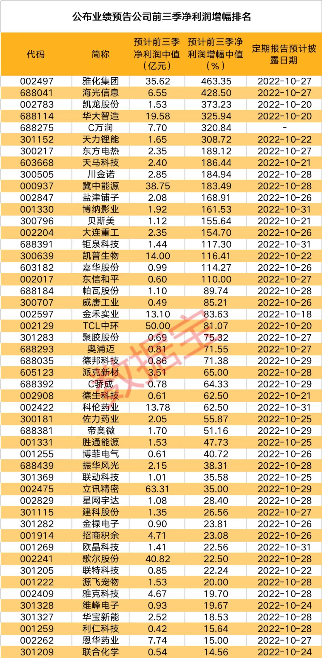 业绩预增公司中,以预计净利润增幅中值统计,共有18家公司净利润增幅超100%;净利润增幅在50%至100%之间的有13家。具体到个股看,雅化集团预计净利润增幅最高,公司预计前三季实现净利润增幅中值为463.35%;海光信息、凯龙股份预计前三季净利润同比增幅中值分别为428.50%、373.23%,增幅位列第二、第三。