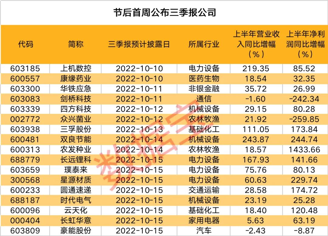 三季报集中在节后的三周内披露,根据交易所定期报告预约披露时间表,节后首周(10月10日至10月15日)将有17家公司率先披露三季报。