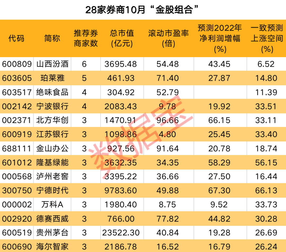 证券时报·数据宝梳理了28家券商10月金股组合,整理出多家券商集中推荐的“金股组合”。其中,山西汾酒和珀莱雅分别进入6家和5家券商10月金股榜单,名列前茅。同属白酒板块的贵州茅台、泸州老窖,银行板块的宁波银行、江苏银行以及新能源板块的宁德时代、隆基绿能等也纷纷上榜。