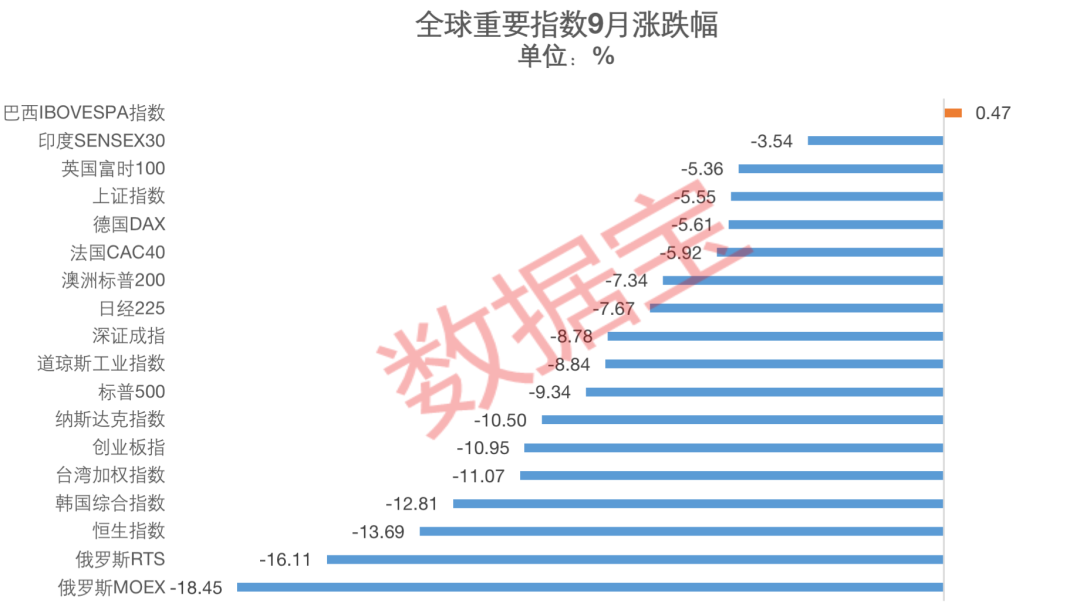 9月,在美联储紧缩决议和能源危机持续影响之下,全球股市普遍下跌。重要指数中,仅巴西IBOVESPA指数录得小幅上涨,涨幅0.47%,其余尽数下跌。俄罗斯MOEX、RTS两大指数领跌,跌幅均逾15%;美股三大指数跌幅则落在8%-11%区间。