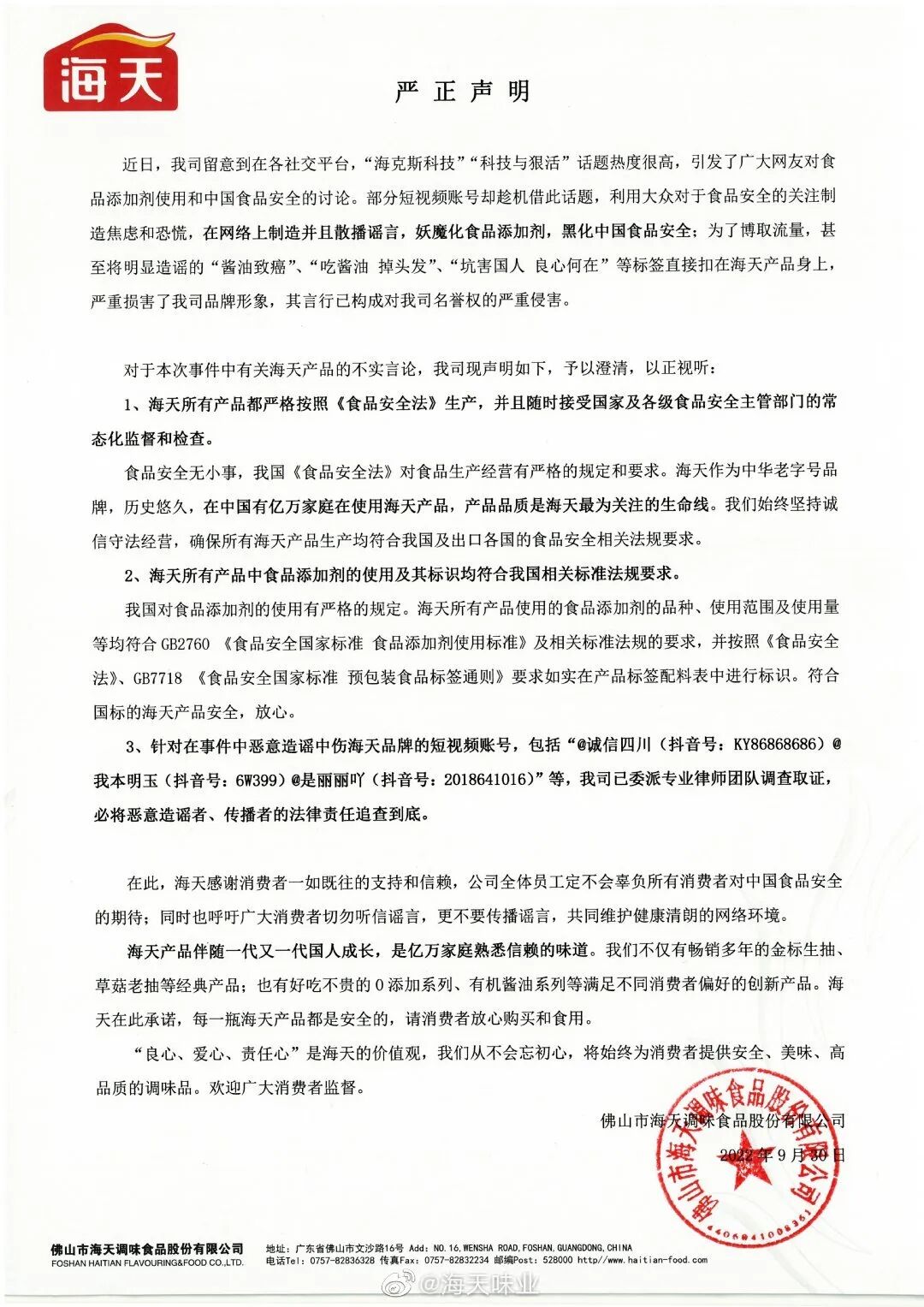对此,9月30日,海天味业在微博平台发布了一份严正声明。其中明确,公司所有产品中的食品添加剂的使用及其标识,均符合我国相关标准法规要求。