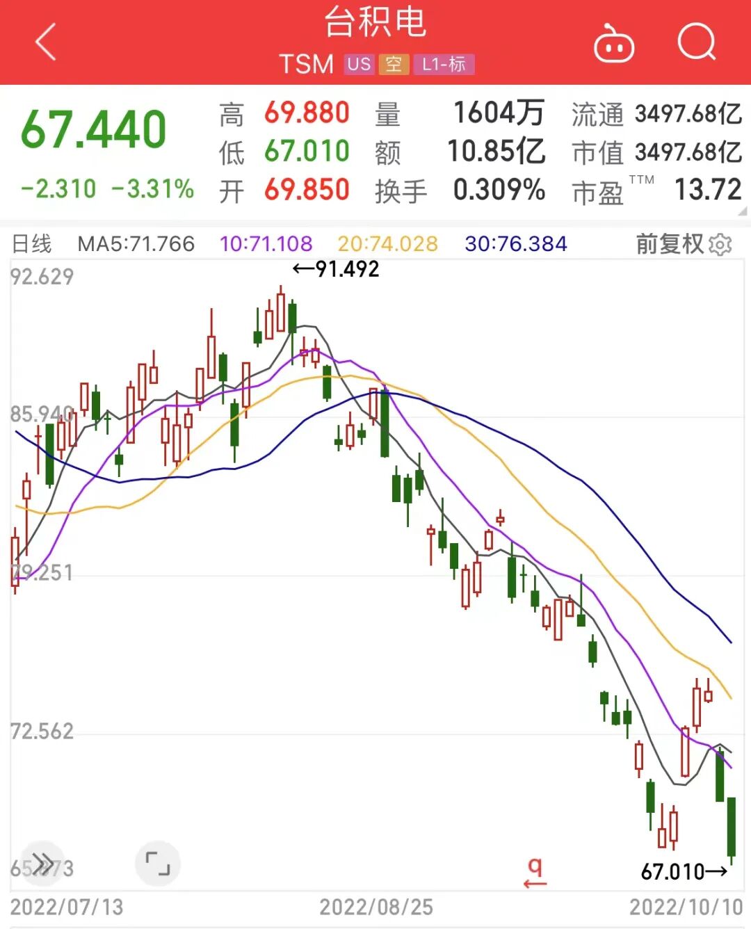 近期全球半导体板块走势疲弱。芯片巨头台积电美股市场持续下跌,10月10日收盘67.44美元/股,创两年来新低,最新市值折合人民币约2.48万亿。与历史高点相比,台积电回撤幅度达到52.85%。