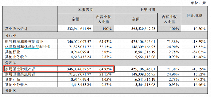 投资者较为关注的电热毯业务属于具体产品类别中的其他分支,营收占比仅仅为公司所有业务的10%,且占比和销量均较去年同期有所下滑。作为对比,彩虹集团的电热毯业务属于半年报中披露的家用柔性取暖产品类别,占公司营业收入比重为64.93%,为公司第一大业务分支,这或许也是市场为何筛选出彩虹集团为电热毯龙头的原因之一。