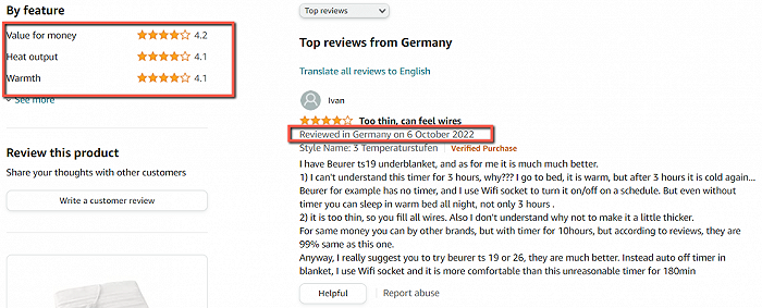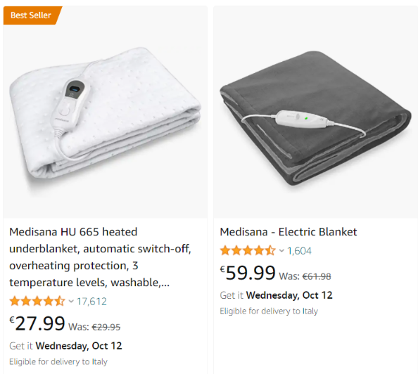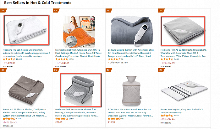 界面新闻记者从Amazon欧洲官网看到,Medisana电热毯产品中HU 665这款型号已成欧洲最为畅销的电热毯,排在亚马逊毛毯类以及取暖产品类畅销榜第一位。此外, Medisana其他两款产品HB 675以及足部加热器也分别位列畅销榜的第四和第六位。