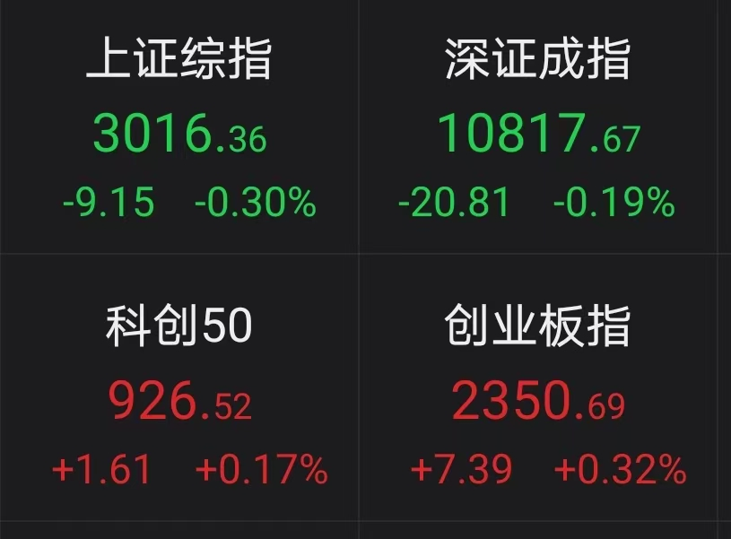 三大股指今日集体低开,沪指弱势震荡收跌0.3%,创业板指一度冲高涨超1%,午后涨幅有所回落,最终收涨0.32%,深证成指收跌0.19%。