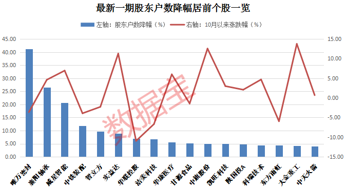数据宝统计,相比上期(9月30日)股东户数下降的股票有132只,唯万密封、襄阳轴承、威星智能、中铁装配的股东户数降幅均超过10%。股东户数降幅最多的是唯万密封,截至10月10日最新股东户数为1.92万户,较上期下降41.21%。