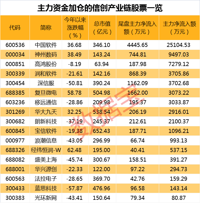 资金面来看,神州数码、金山办公、高鸿股份、启明星辰等34只股获得主力加仓,其中中国软件的主力净流入额最高,达2.51亿元。结合尾盘数据来看,获得主力加仓且尾盘主力保持净流入的个股有17股,包含高鸿股份、神州数码、经纬恒润-W、复旦微电等多只半年报业绩同比翻倍增长的绩优股。