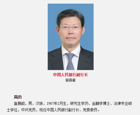 10月20日,人民银行官网行领导一栏显示,宣昌能任中国人民银行副行长、党委委员。