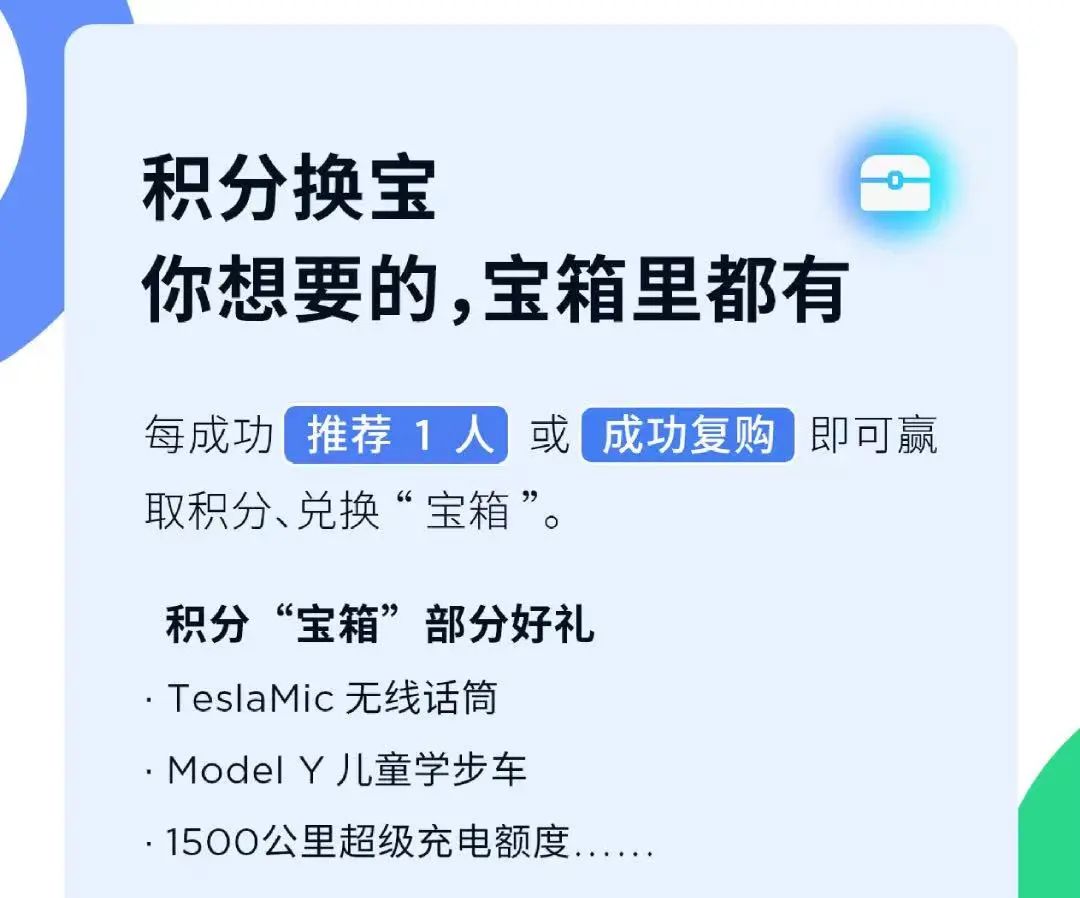 除了官宣降价外,特斯拉还宣布“宝箱”积分奖励上线,无论是特斯拉车主或是准车主,推荐好友成功提车后,均有机会赢取奖励。