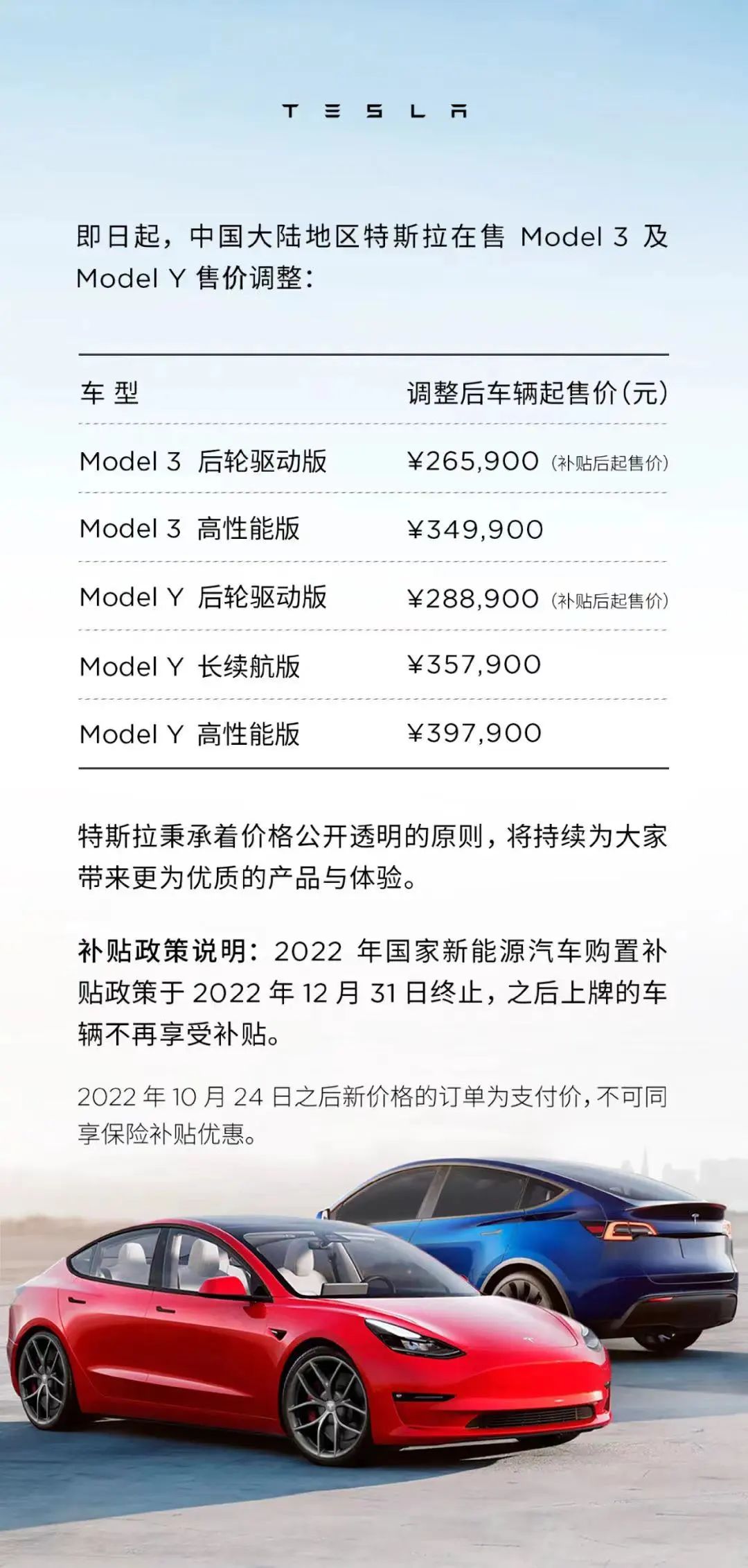 “特斯拉秉承着价格公开透明的原则,将持续为大家带来更为优质的产品与体验。”特斯拉方面表示,2022年国家新能源汽车购置补贴政策于2022年12月31日终止,之后上牌的车辆不再享受补贴。