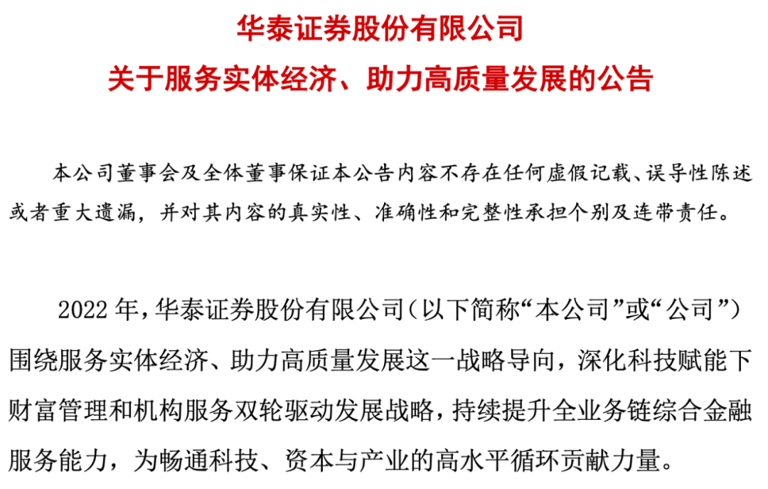 华泰证券也表示,未来将以国家全新战略部署为导向,继续发挥连接实体经济与资本市场的桥梁作用,在服务现代化产业体系发展、创新驱动发展以及绿色发展等重点领域做精做专,推动“双轮驱动”战略实现新进阶,向高质量发展坚实迈进。