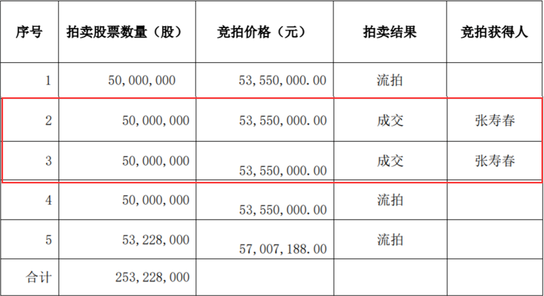 张寿春近日也出现在庞大集团的股权拍卖竞买名单中。在庞大集团披露的于9月26日~9月27日的股权司法拍卖中,5笔拍卖有3笔流拍,2笔成交,而这两笔竞买人均为张寿春。具体来看,张寿春合计竞买入1亿股,竞拍价格为1.07亿元(见表1)。
