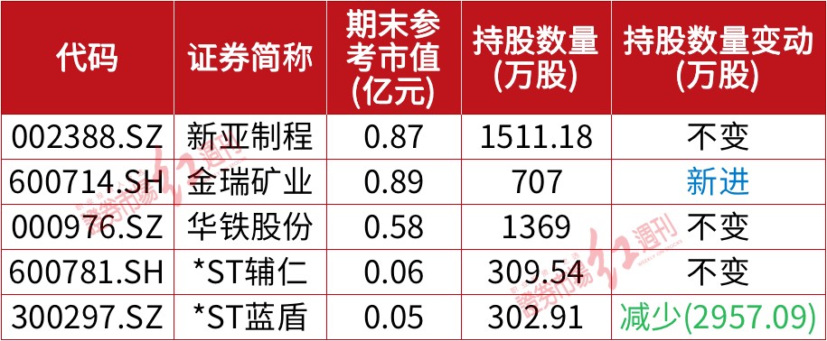 《红周刊》注意到,今年二季度末,张寿春的名字出现在包括新亚制程、金瑞矿业、华铁股份、*ST辅仁、*ST蓝盾在内的5 只个股的前十大流通股东中,合计持仓市值为 2.45 亿元。其中,对所持个股“态度”不一,除对部分个股“无变动”式持有外,对其他个股则有增有减(见表3)。