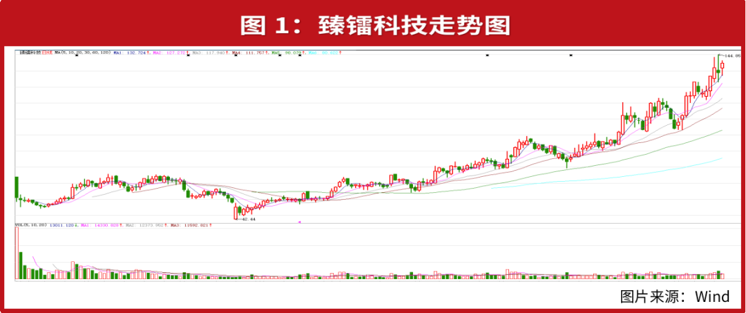目前5只重仓标的中,赵吉与其父赵建平共同持有的臻镭科技的走势最为彪悍。