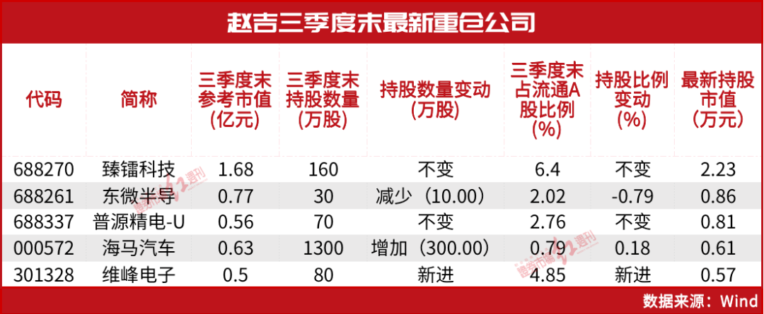东微半导、普源精电-U、维峰电子、海马汽车4家公司本周最新披露的三季报中,赵吉也分别以继续持有或新进持有的方式显现身影。