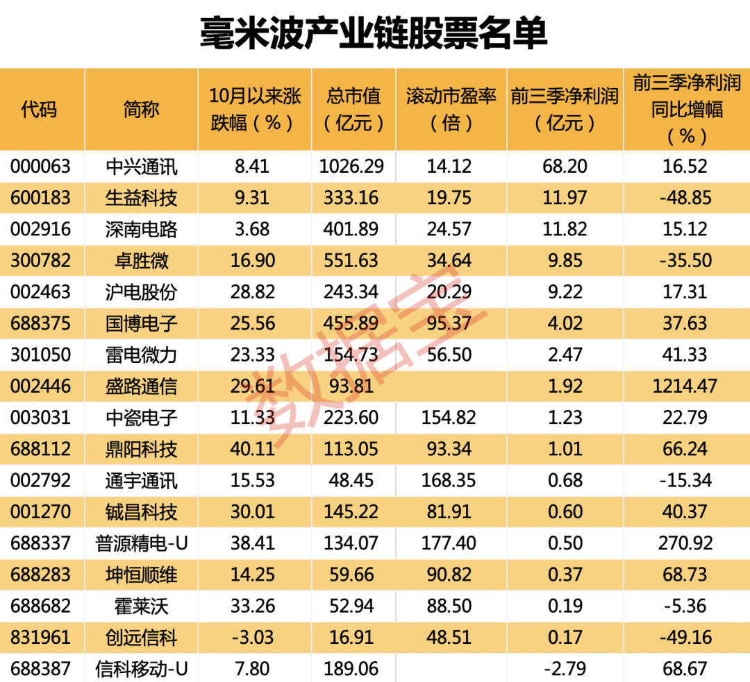 证券时报·数据宝统计,A股中有17家上市公司布局毫米波产业链,其中包含TR芯片及组件相关上市公司国博电子、卓胜微以及PCB概念股深南电路、生益科技等。