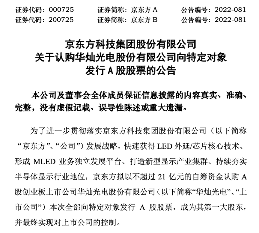昨日晚间,京东方A发布公告,拟不超过21亿元的自筹资金认购华灿光电股份有限公司(以下简称“华灿光电”)向特定对象发行的A股股票,认购完成后将以23.08%持股比例成为该公司第一大股东。
