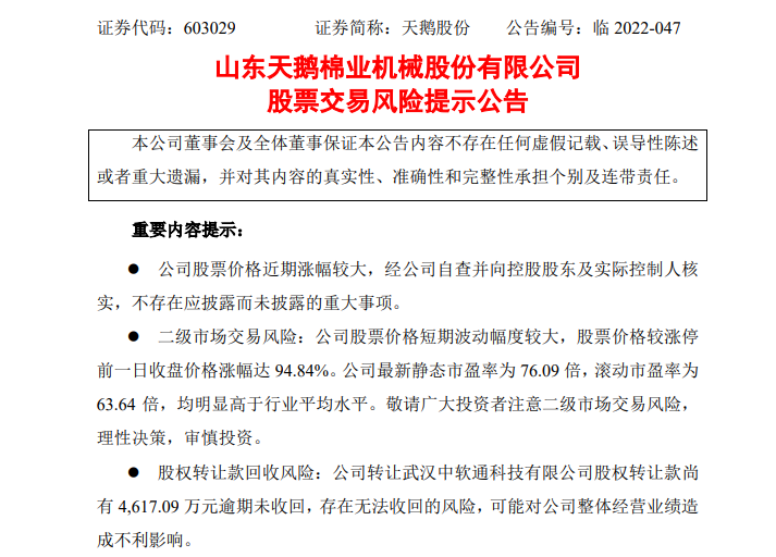 11月7日晚,“6连板”的天鹅股份再次发布异动公告,在表示不存在应披露而未披露的重大信息的同时,该公司还提示了两方面风险,一是股权转让款回收风险,二是专利诉讼风险。而11月8日,天鹅股份再次涨停,公司再度发布了股票交易风险提示公告。