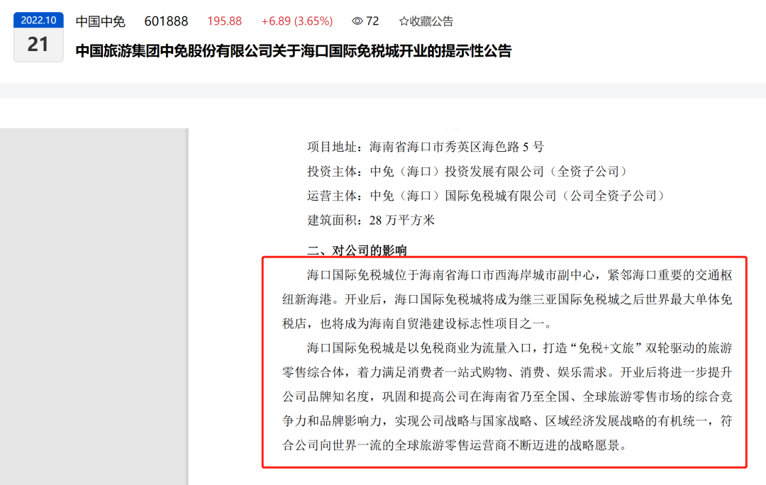 据中国中免公告,建筑面积28万平方米的cdf海口国际免税城,位于海口市西海岸城市副中心,系三亚国际免税城之后世界最大单体免税店,其背靠的免税城将会引进近千个国际和国内品牌,打造集零售、体验和餐饮为一体的复合业态。而总建筑面积10.25万平米的王府井国际免税港则落地万宁,拟于2023年1月开业。
