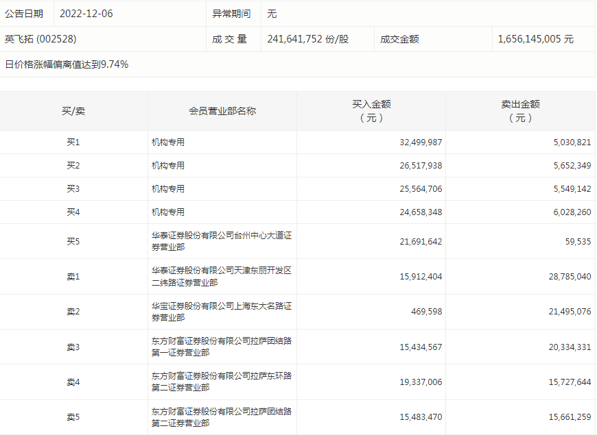 证券时报网讯,英飞拓今天涨停。盘后数据显示,4个机构出现在龙虎榜单上,合计净买入8698.04万元;华泰证券股份有限公司天津东丽开发区二纬路证券营业部买入1591.24万元,同时卖出2878.5万元;东方财富证券股份有限公司拉萨团结路第一证券营业部买入1543.46万元,同时卖出2033.43万元。