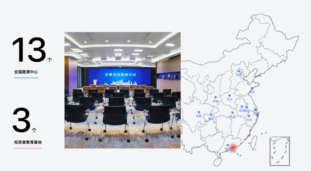 全景路演利用全景13地路演厅专业音视频设备,专线互联已有优势,打造高质量路演。无论您在北上广深,还是祖国的大西北、大华南,都能找到我们的全景路演厅,为您节约时间成本,就近开启一场面向全网的专业路演。