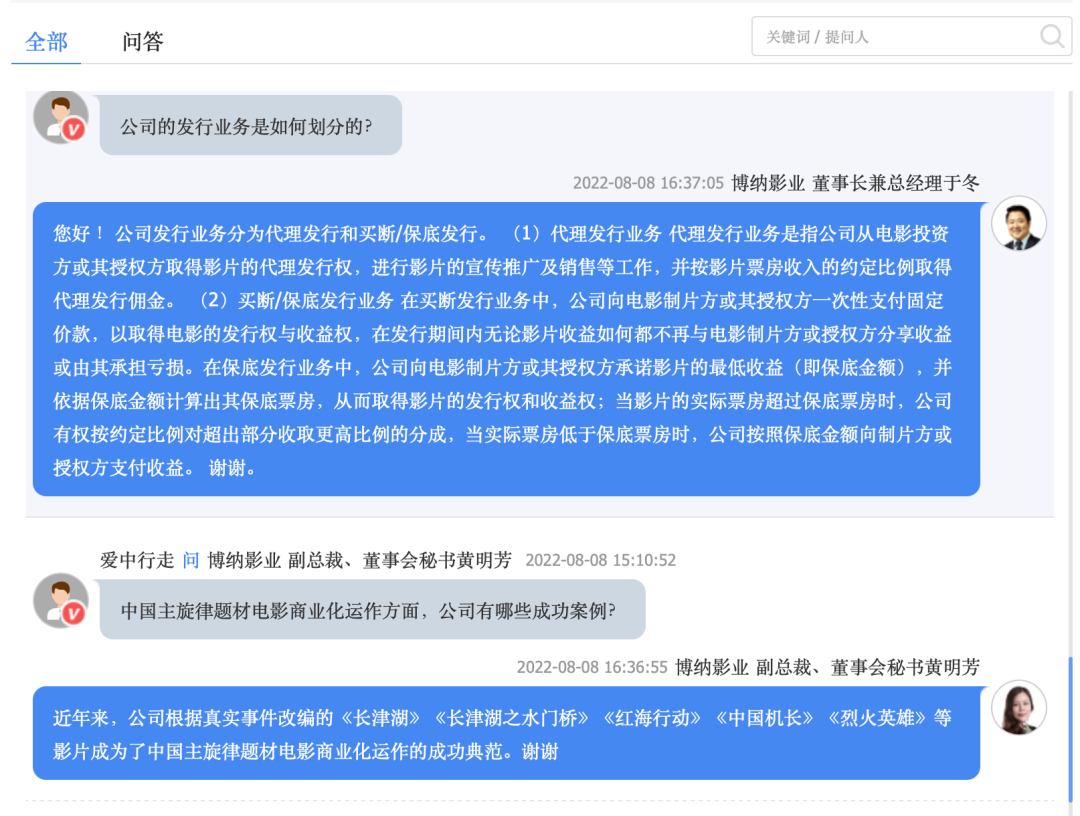 博纳影业IPO路演投资者与上市公司高管提问互动