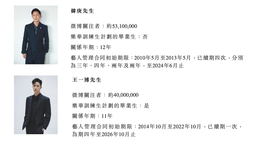 乐华娱乐此前披露,公司共有69名签约艺人,及59名参加训练生计划的训练生。公司主要通过安排签约艺人参加商业活动例如代言、商业宣传,提供娱乐内容服务如出演电影、剧集、综艺节目等产生收入。