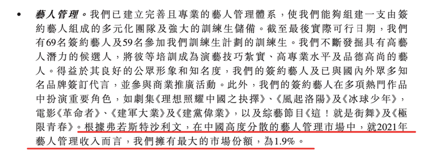 乐华娱乐公告显示,根据弗若斯沙利文数据,在国内高度分散的艺人管理市场中,乐华娱乐2021年艺人管理收入排名第一,市场份额为1.9%。乐华娱乐也因此被视为港股市场“艺人管理第一股”。