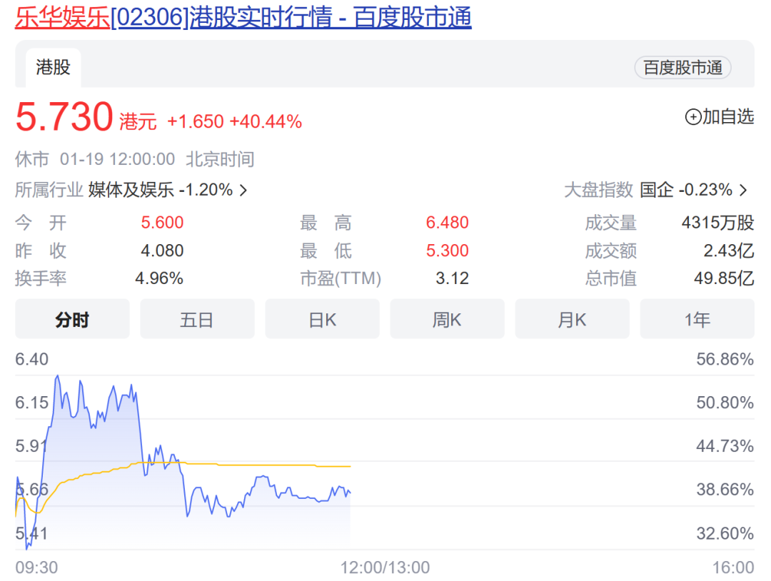1月19日,乐华娱乐开盘报5.6港元,高开37%。盘中乐华娱乐涨幅一度超过50%,市值超过50亿港元,截至收盘,涨幅达40%,市值49.85亿港元。