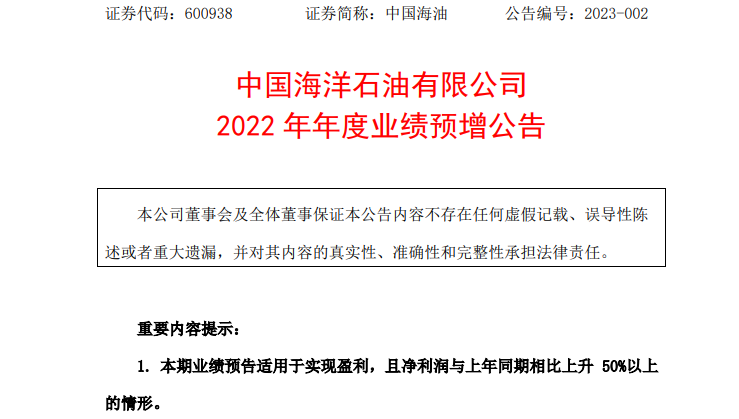 中国海油表示,2022年公司抓住油价上涨机遇期,坚持稳中求进总基调,扎实推进油气增储上产、提质增效升级工作,进一步巩固成本核心竞争力,提升价值创造能力,盈利水平同比大幅提升。