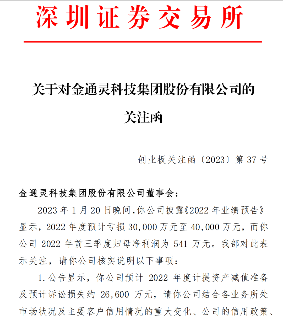 前三季度净利润500多万元,全年却预亏3亿元至4亿元,业绩“变脸”的金通灵(300091)1月31日收到深交所关注函。针对计提商誉减值准备约7000万元,深交所要求公司说明是否存在调节利润的情形;针对预计计提资产减值准备及预计诉讼损失约2.66亿元,深交所要求公司说明计提原因及合理性。