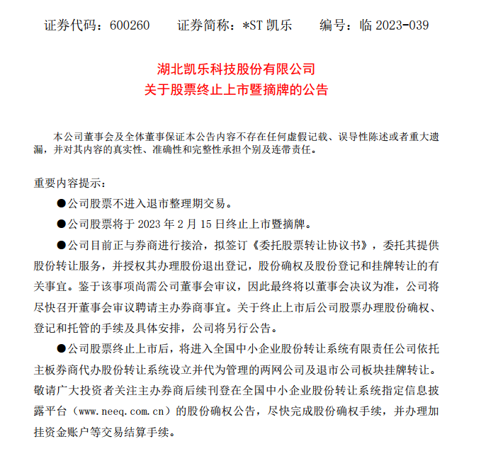 2月8日晚,*ST凯乐发布公告称,公司股票将于2023年2月15日终止上市暨摘牌。因触及的是交易类退市指标,公司股票不进入退市整理期交易。