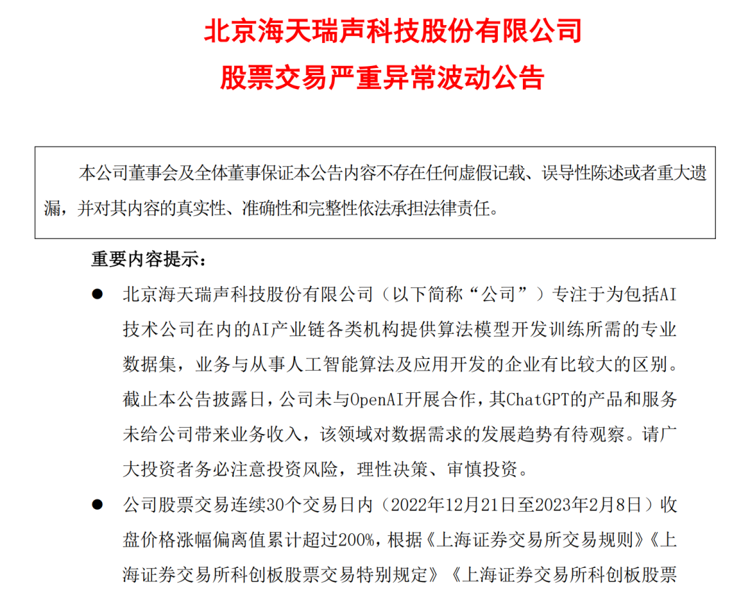 8日晚间,海天瑞声发布的股票交易严重异常波动公告表示,公司专注于为包括AI技术公司在内的AI产业链各类机构提供算法模型开发训练所需的专业数据集,业务与从事人工智能算法及应用开发的企业有比较大的区别。截至公告披露日,公司未与OpenAI开展合作,其ChatGPT的产品和服务未给公司带来业务收入,该领域对数据需求的发展趋势有待观察。