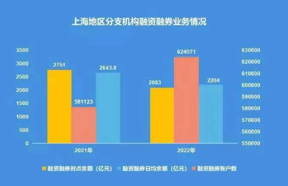 再看信用业务收入,2022年上海地区营业部融资融券账户数为62.4万户,相较上年的58.1万户增加7.4%;融资融券余额却同比小幅下滑,显示杠杆资金活跃度有所下降。