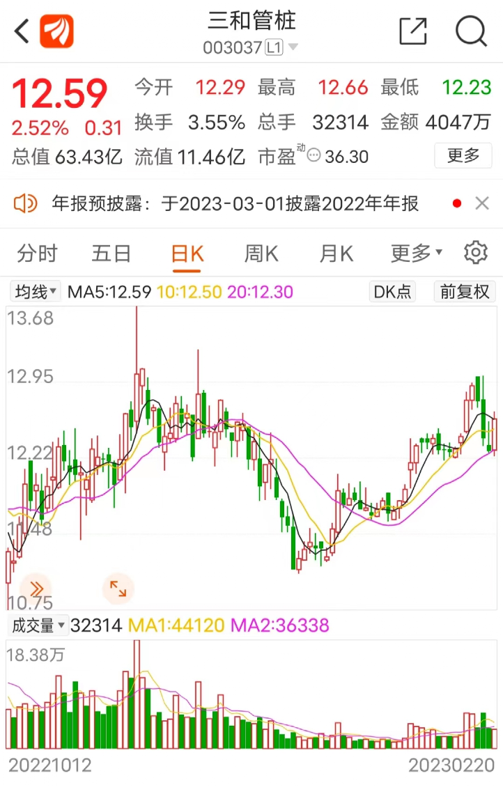 截至2023年2月20日,三和管桩股价为12.59元/股,市值为63亿。