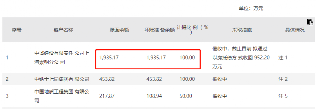 具体来看,公司全资子公司苏州三和从2017年开始作为供货方为“长兴岛项目”销售管桩,该项目的购货方为中城建设有限责任公司(包括中城建设有限责任公司上海崇明分公司)。2019年底,由于中城建设被列入失信被执行人名单,应收款可回收性降低,出于谨慎性原则,公司对中城建设的应收款项1935.18万元全额计提了坏账准备。